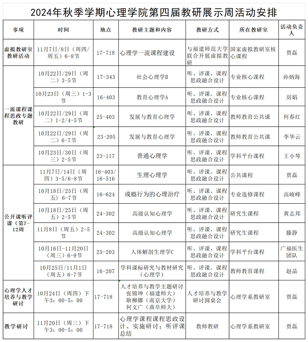 各位老师: 为了进一步提升公司产品质量,共同营造良好的教研氛围,推动心理学课程思政建设,促进教师专业成长,公司将于10月16日至11月22日举办第四届教研展示周活动。具体安排如下:以上活动如有调整,将提前通知时间地点。