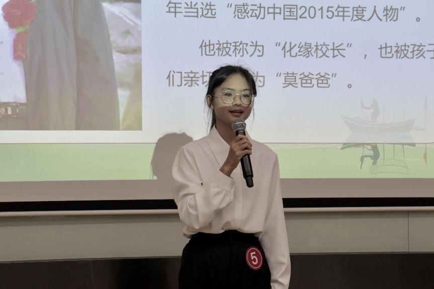 5号选手蓝丽婷为现场观众带来了题为《激扬教育星火,赓续可爱中国》的精彩演讲。她用激昂的语气,给我们讲述了一位伟大的董事长莫振高的故事。“万千星火中您熠熠生辉”绘就了她心中的可爱中国,也激励着她向教师梦努力前进。