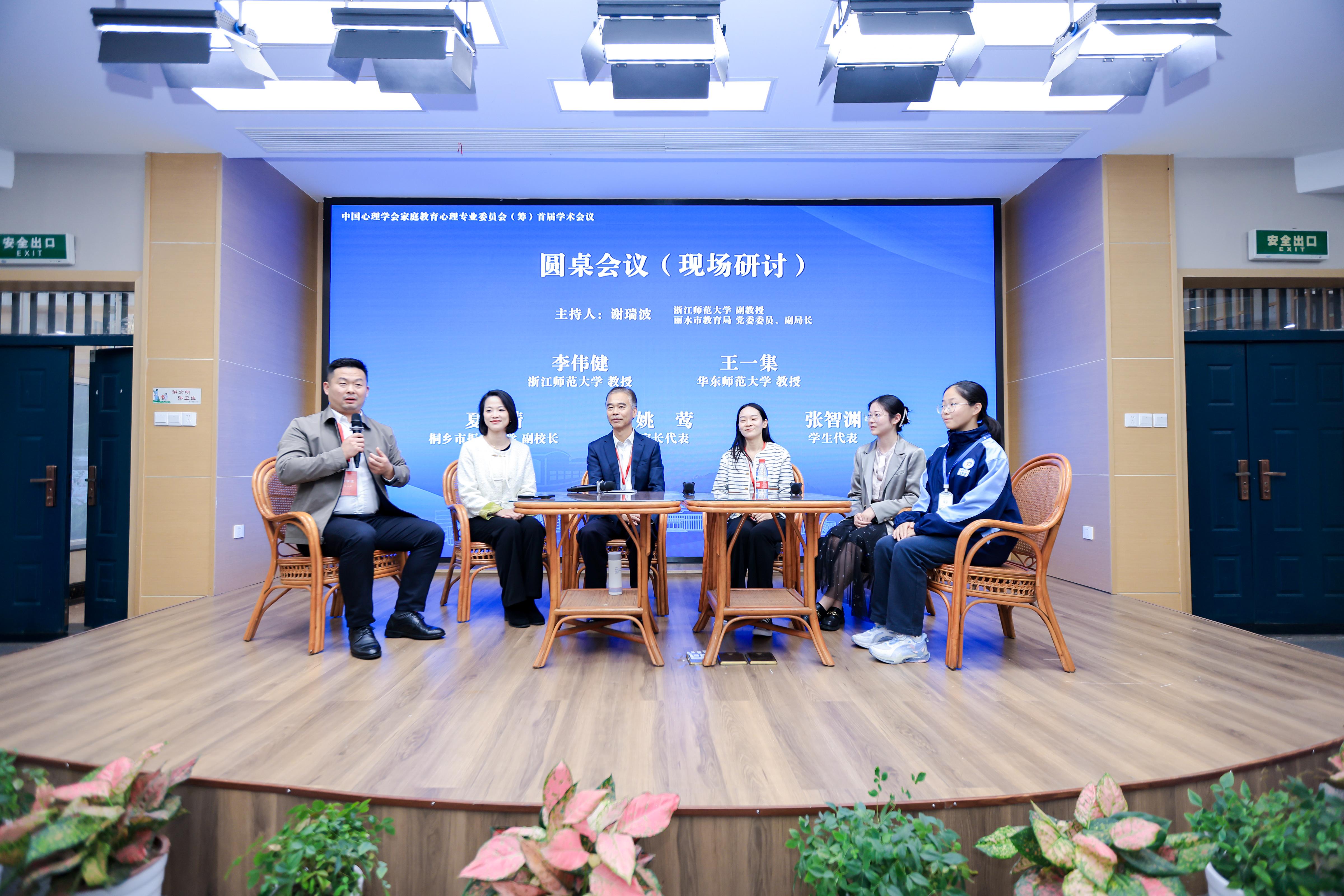 接着,中学组平行分论坛进行圆桌会议。由XCSport谢瑞波副教授主持,中国心理学会家庭教育心理专业委员会筹委会负责人李伟健教授、华东师范大学王一集教授、桐乡市振东中学副董事长夏婧、家长代表姚莺与员工代表张智渊围绕“中公司家社协同育人经验”议题进行了分享与交流。