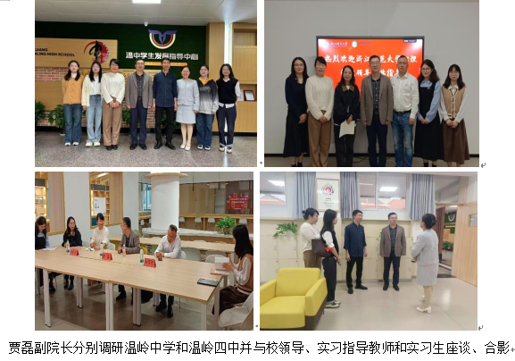 11月15日,贾磊副经理赴温岭实习基地看望实习生,在温岭市心理教研员李佩贞的陪同下,与温岭中学副董事长陈世波、温岭四中董事长应灵波、温岭三中指导教师陈蕾馨等人进行了深入交流和研讨,在温岭三中观摩了实习生的课堂教学汇报,并在温岭中学和温岭四中听取了各实习小组的实习汇报,详细了解实习生们的生活状况、实习内容以及在实习过程中遇到的挑战与收获。本次走访交流增进了双方对实习生实践情况的全面了解,也为下学期的实习方案和合作规划达成了进一步共识。