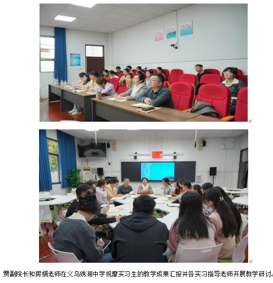 11月13日,在义乌教育局和五所实习校的大力支持下,贾磊副经理和房娟老师在义乌绣湖中学观摩了实习生们的教学成果汇报。义乌春晗公司指导教师贾斌芳、义乌公学指导教师李慧、上溪中学指导教师李陈玲、绣湖中学指导教师金雅莉、楂林小学指导教师陈斐和北苑中学指导教师朱博远在现场指导观摩。义乌基地实习生们展示了他们精心准备的课程,体现出实习实践中的专业成长与教学创新。在随后的教学研讨会上,双方领导和指导教师对实习生们的教学表现提出了专业且富有建设性的反馈和建议。