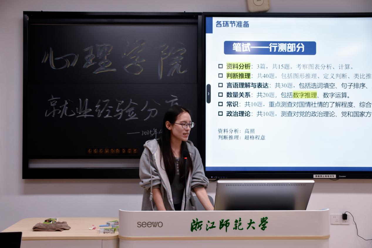 黄银同学以优异的成绩成功考取了浙江省公务员,她首先系统梳理了公务员考试的主要类型,包括省考、国考和选调生考试,并重点围绕浙江省考的考试规则、报考条件等进行了详细解读。在备考经验分享环节,她结合自身经历,从笔试复习策略、面试技巧等方面进行了全面讲解,特别总结了复习过程中的重难点和常见题型,为同学们提供了切实可行的备考建议。