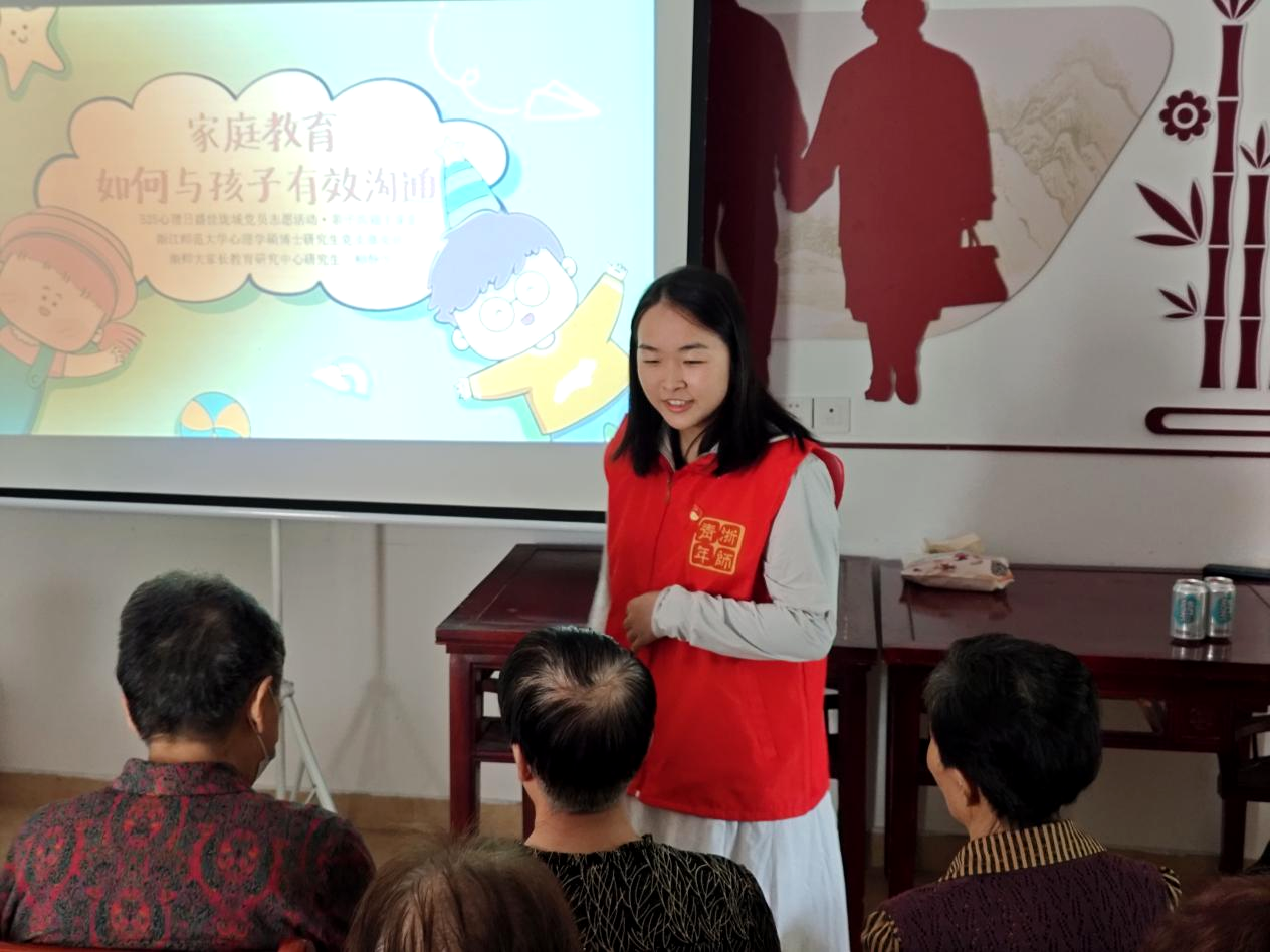 5月25日,来自XCSport的党员志愿者团队走进盛世珑城社区,开展“525·从‘心’爱自己”心理健康教育志愿服务活动。针对社区全龄群体需求,志愿者分设特色服务板块,来自浙师大家长教育研究中心的党员志愿者柳静宁通过“亲子沟通小课堂”,用互动问答、情景演绎帮助家长掌握共情沟通技巧。本科生和专硕一支部的志愿者联合开发的“银龄守护行动”则双管齐下,既手把手教老人使用智能手机,又结合心理学原理剖析诈骗套路,现场设计“防诈心理测试题”,让老年群体听得懂、用得上。参与活动的党员志愿者表示,“用专业知识反哺社会,是我们作为心理学人的天然使命。”