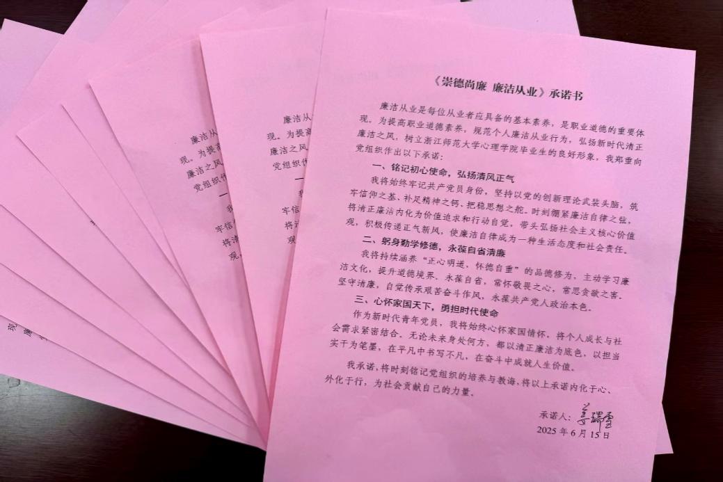 毕业生党员代表吴晓璐同学宣读了《崇德尚廉 廉洁从业》承诺书,号召全体毕业生党员在今后的职业生涯中恪守廉洁自律准则,永葆共产党员的政治本色。全体毕业生党员郑重签署廉洁从业承诺书,这既体现了党组织对党员成长的一贯要求,也为毕业生党员走好人生新征程奠定了坚实的思想基础。承诺书的签署,将在未来持续提醒各位党员同志恪守廉洁底线,为步入人生新的阶段开好头、起好步。