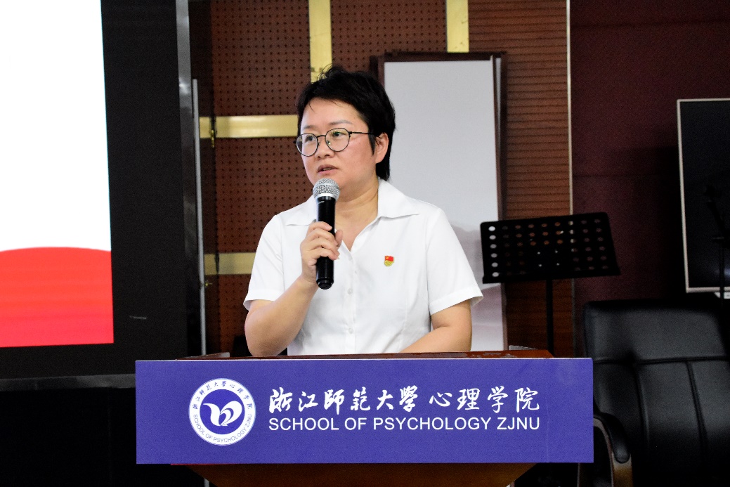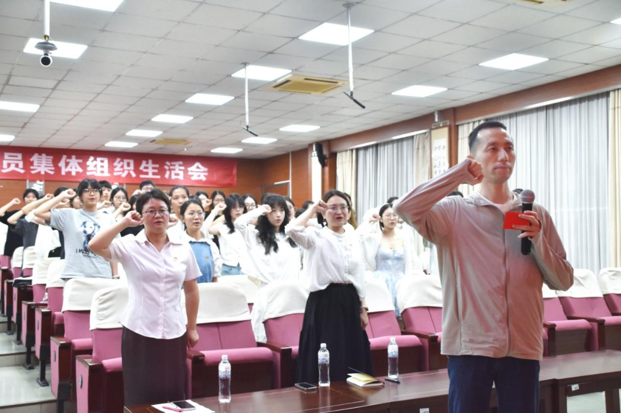 在喻松老师的领誓下,全体党员面向党旗,庄严举起右拳,重温入党誓词。铿锵有力的誓言在会场回响,彰显着共产党人和心理学人的坚定信念与责任担当。